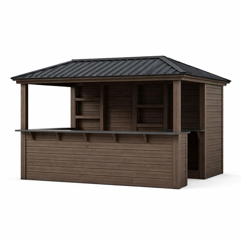 Diese Gartenbar besteht aus Kiefernholz und hat ein Dach aus verzinktem Stahl.