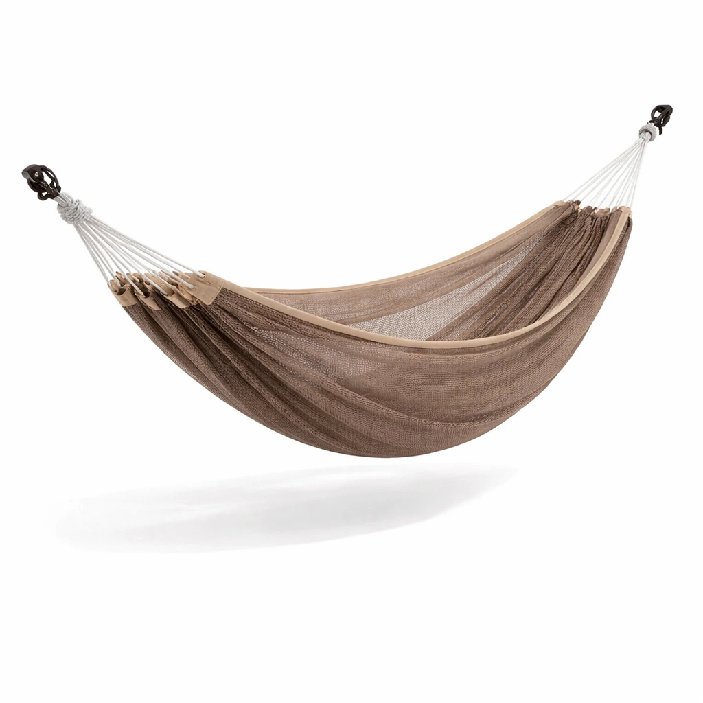 Die Hängematte ist in einem Braunton gehalten und kann mithilfe stabiler Haken und Seile zwischen zwei festen Punkten installiert werden.