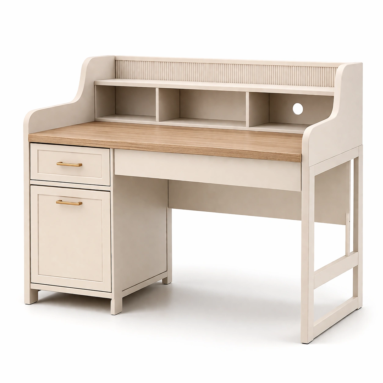 Schreibtisch mit Regalaufsatz für effektive Stauraumnutzung.