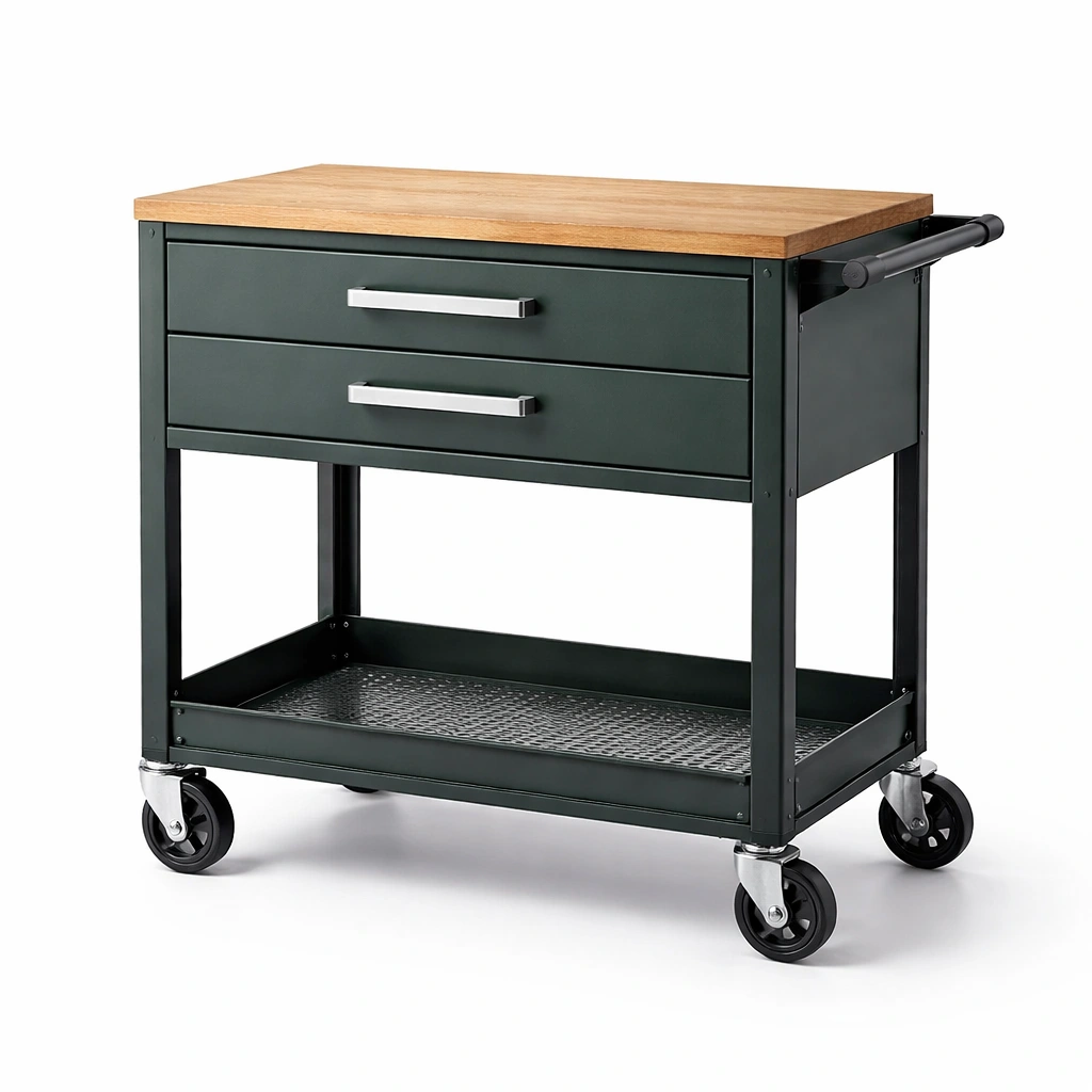 Der Rollwagen besteht aus einer Arbeitsplatte aus Eichenholz sowie einem Rahmen und Schubladen aus Stahl. Er ist dunkelgrün gehalten.